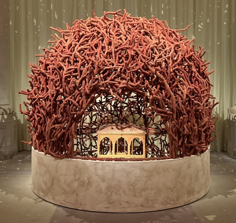 Le visiteur traverse huit sections, débutant par "L'Antichambre" de Louboutin ornée de motifs indiens du XVIIIe siècle, puis des salons drapés évoquant palais indiens et ateliers contemporains. Des œuvres comme "Lune de Bois II" de Simone Pheulpin côtoient pièces patrimoniales des Manufactures nationales et créations de résidences Villa Swagatam*. Ce dialogue croise art contemporain, artisanat d'art et design, soulignant la transmission gestuelle et matérielle.