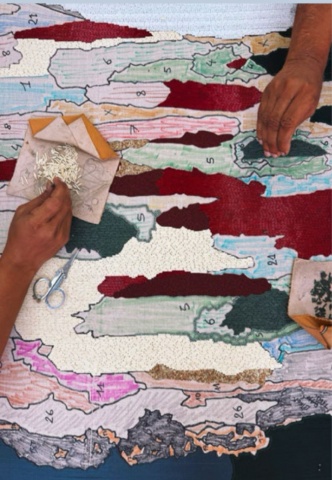 Crédits : photo 1 Les brodeurs de Kalhath Institute, Luknow, en train de réaliser des pièces de l'artiste Pauline Guerrier. © Pauline Guerrier. / photo 2 Ladies from the back, Elvire Voynaroska ©Jaipur Rugs / photo 3 Travelling Roots, Jean-François Lesage, Chennai, Tamil Nadu, collection de Shon Randhawa ©DR. Les photos ont été publiées avec l'aimable autorisation de l'Institut Français.