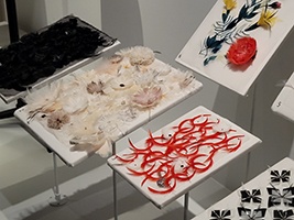 est conçue pour une observation de près : échantillons à disposition et tables équipées de loupes permettent au public d’examiner les points, textures et effets de surface.